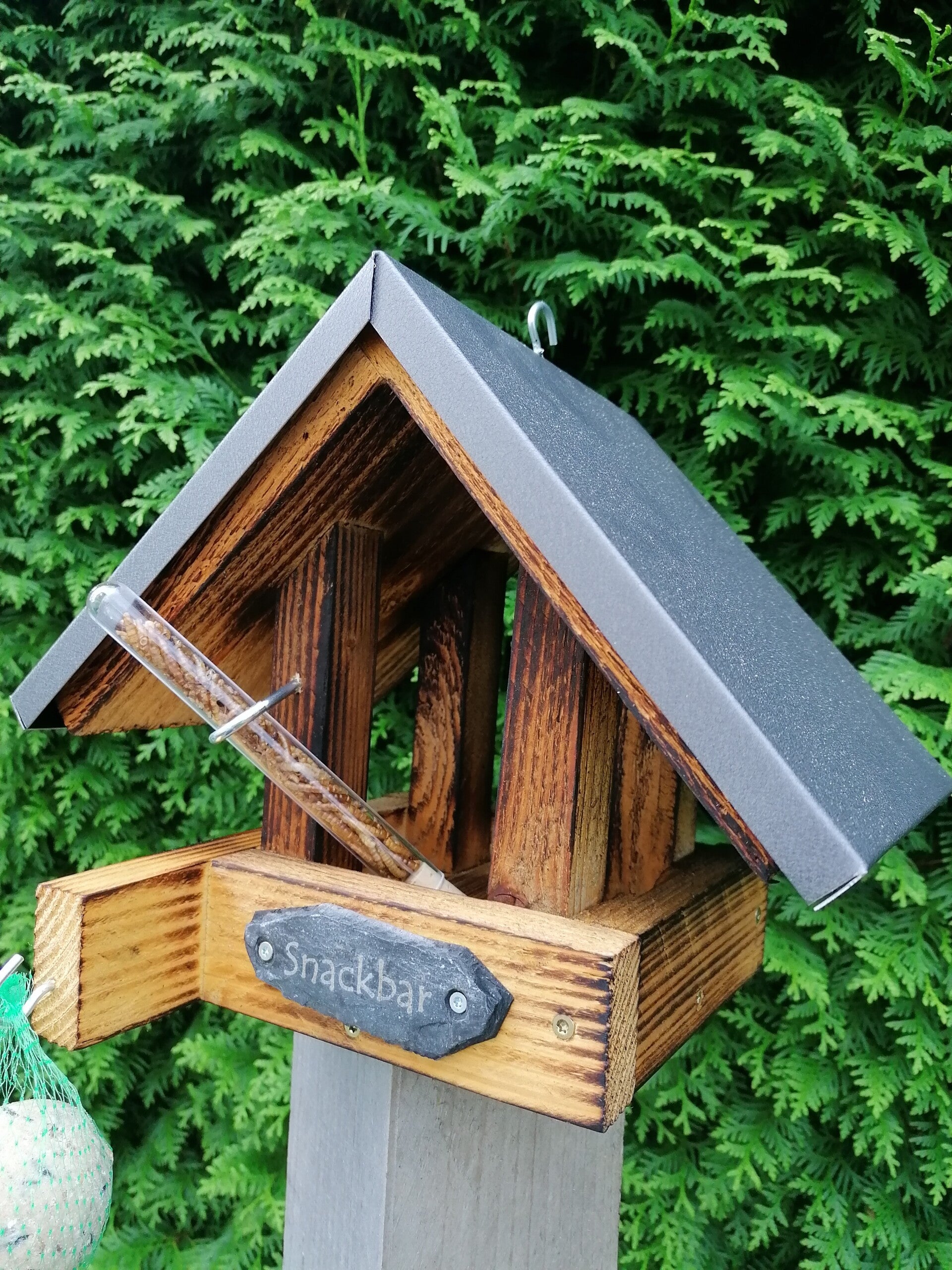 Das Futterhaus "Snackbar" ist ein sehr edles Futterhaus für Wildvögel. Es ist was besonderes, man füllt einfach Futter in das Haus, dazu kann man noch einen Meisenknödel vorne an der Verlängerung dran hängen.